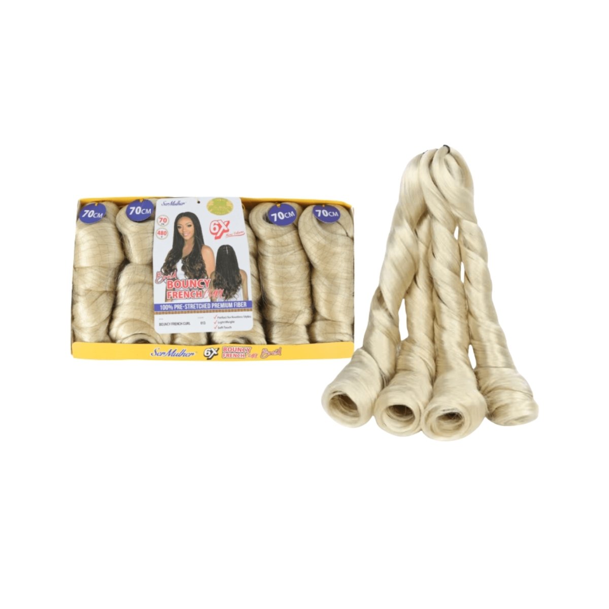 A French Braid 6x – cor 613 combina praticidade e estilo com fios pré-torcidos e pré-esticados de fibra premium. O tom blond 613 é perfeito para quem deseja um look arrojado, luminoso e cheio de presença. Ideal para box braids, twists ou penteados soltos com muito volume e textura.